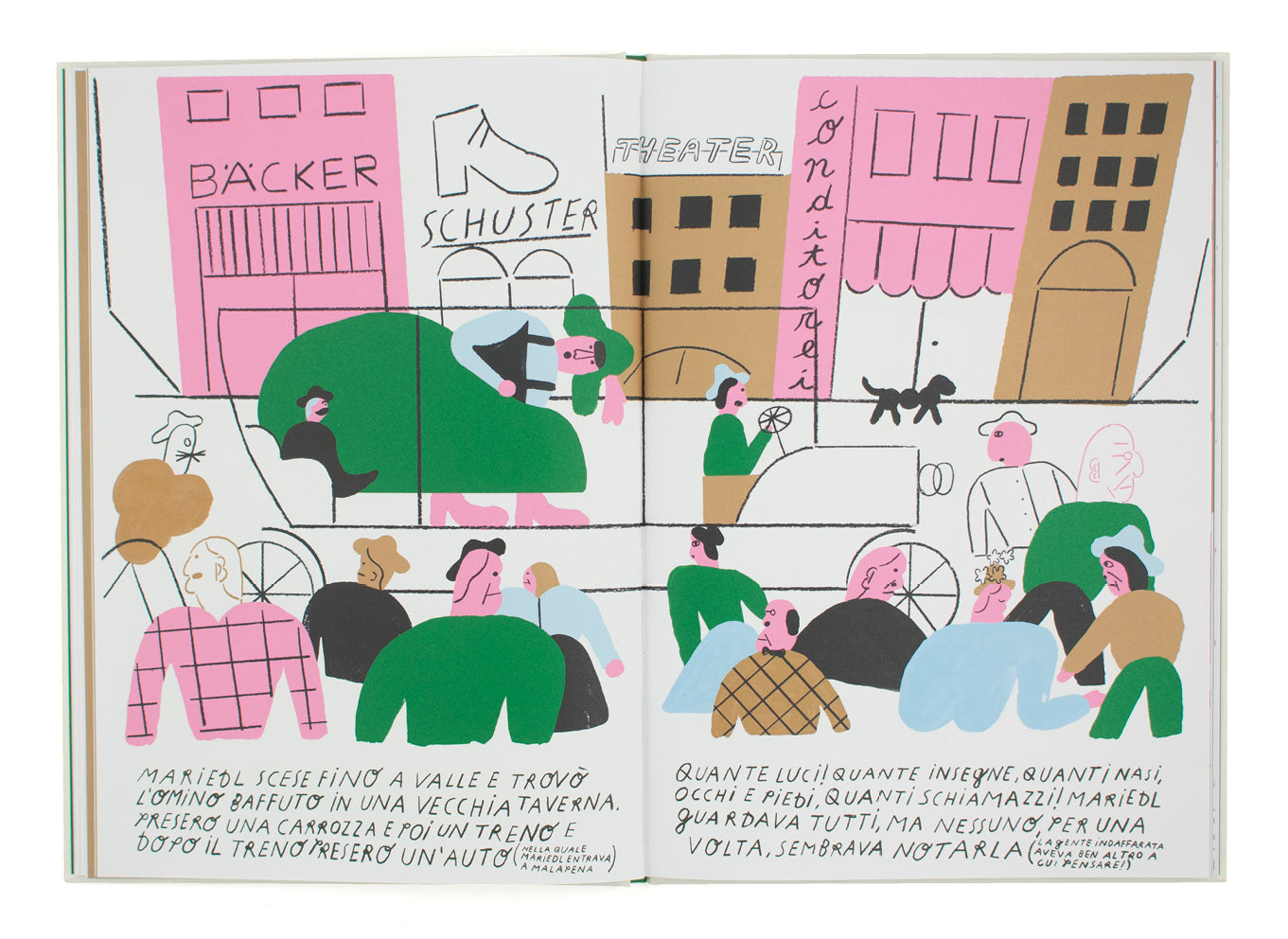 Based on the true story of a young woman who lived in the South Tyrol in the 19th century, Mariedl, Una storia gigantesca is an emotional and moving tale with illustrations that mix brown, dark green and pink, and handmade lettering.on in French of Bruno Munari's book Nella nebbia di Milano