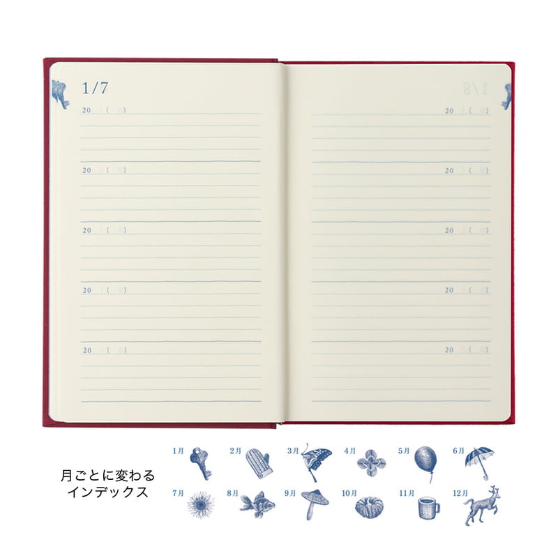Each page of the diary is divided by 10 sections, so you can record the day's events and remember those of previous years at the same time. The pages of each month are marked by a unique illustration printed on the edge of the page. Once the diary is closed, the illustrations act like index tabs, letting you quickly flip to the month you want. The diary has two ribbon page markers to let you keep track of the day you're on.
