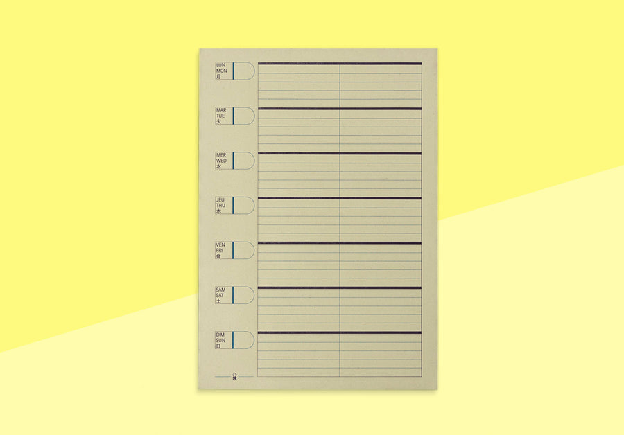 Der A4-Notizblock ist im Letterpress-Verfahren bedruckt und enthält auf jedem Blatt ein Wochenplanraster in drei Sprachen. Er eignet sich ideal, um Ihre Wochen zu organisieren und Notizen zu machen. Die Blätter lassen sich leicht heraustrennen. Die Blöcke werden vollständig in Brüssel handgefertigt.