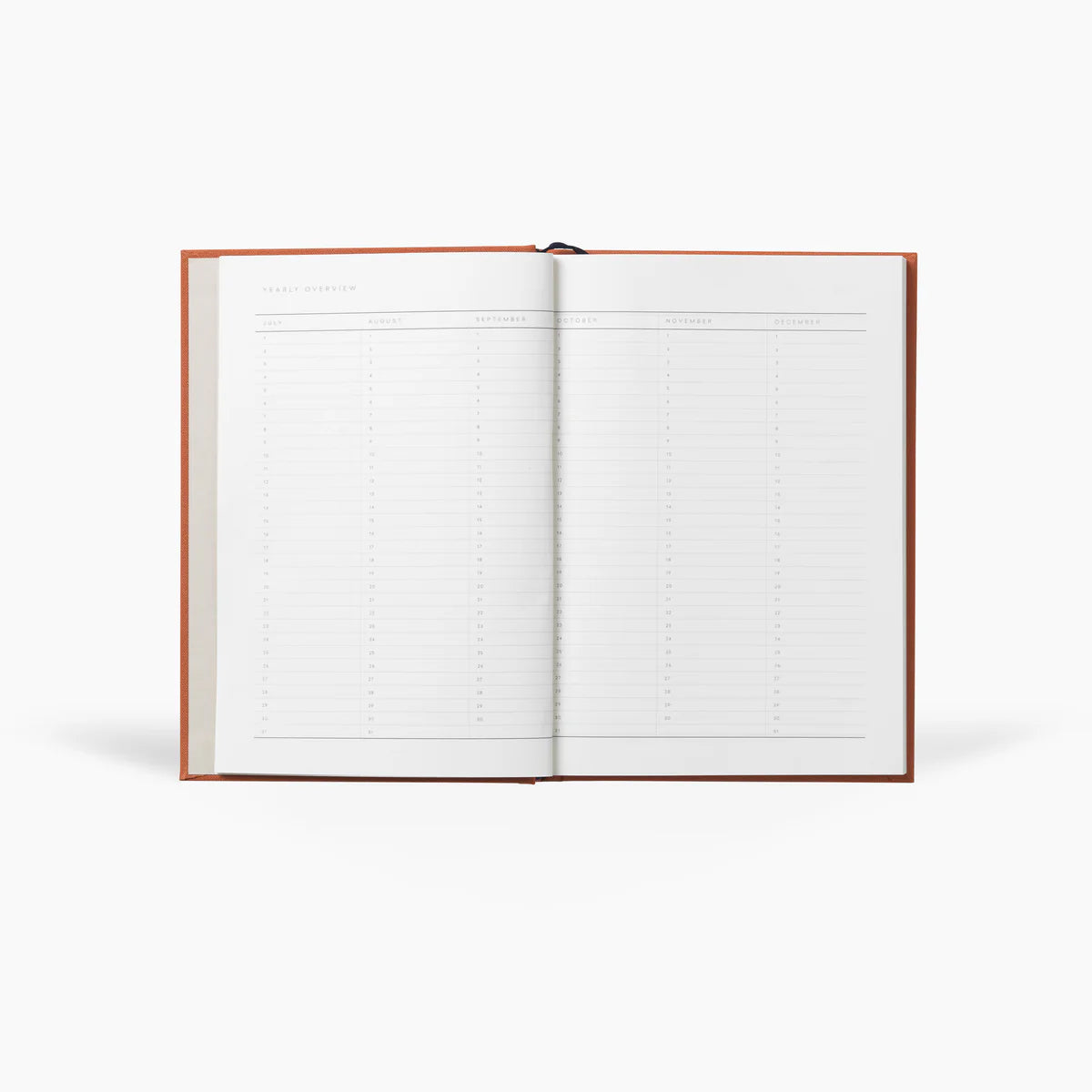 Dieser Kalender ohne Termine enthält eine Seite für Kontaktinformationen, eine Jahresübersicht (Jan.-Dez., 4 Seiten), 56 Wochenseiten mit Tagen auf der linken Seite und Zeilen für freie Notizen auf der rechten Seite (56 Wochen, 112 Seiten), einen zusätzlichen Notizteil (28 Seiten), eine Liste für Aufgaben (14 Seiten, zwei Listen pro Seite) und eine Seite für wichtige Notizen.