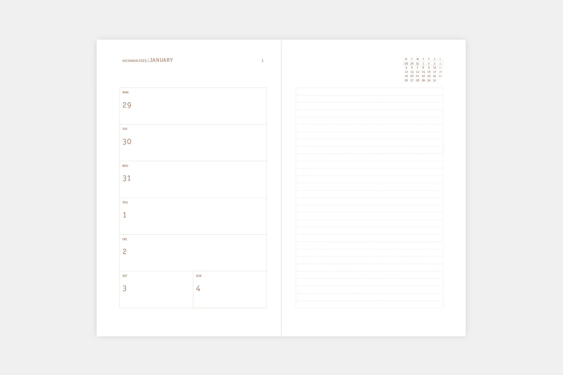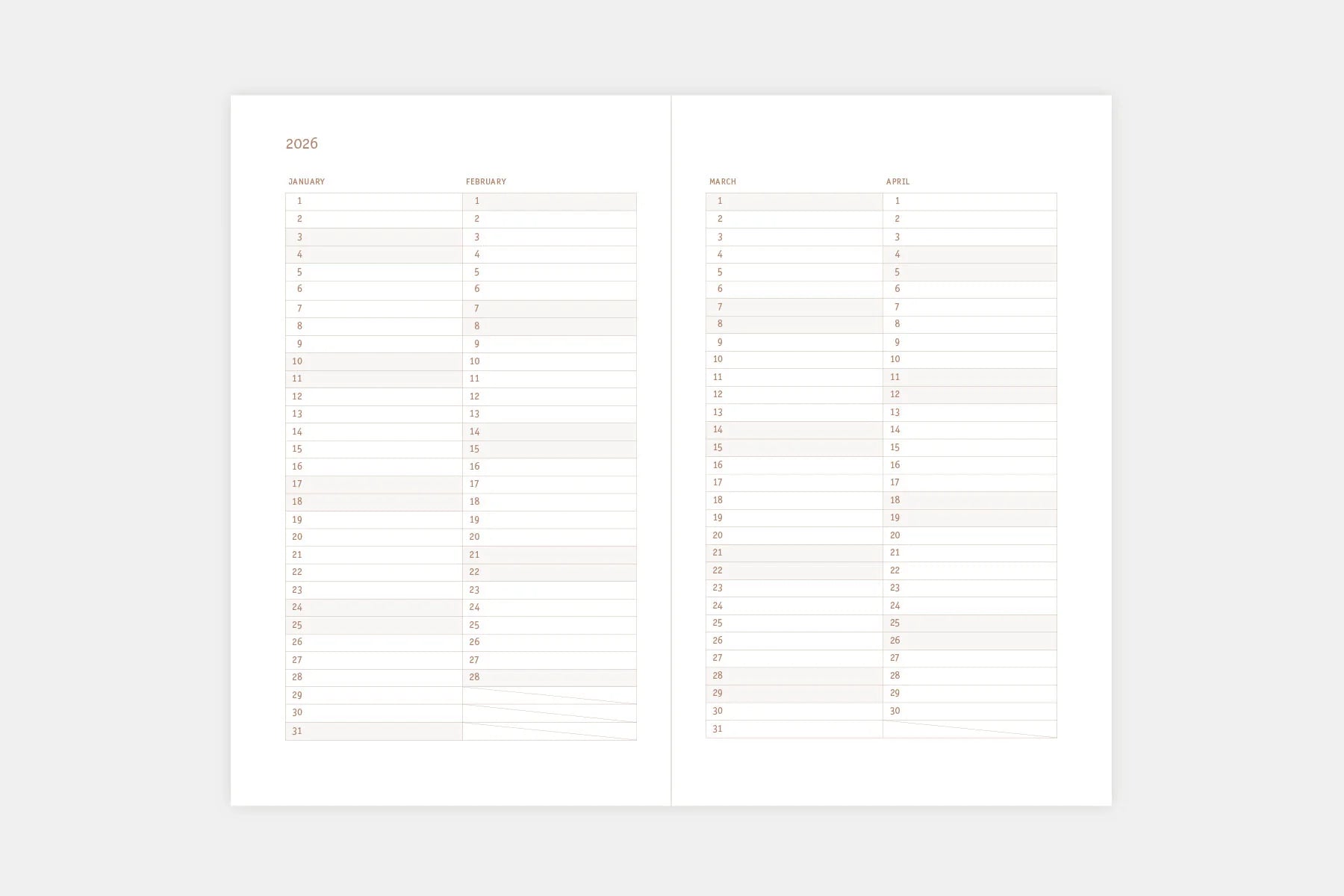 Der Copper Light 2026 Kalender ist schlicht gestaltet und verfügt über einen flexiblen Einband und eine Lay-Flat Bindung. Er läuft von Januar bis Dezember für das Jahr 2026.