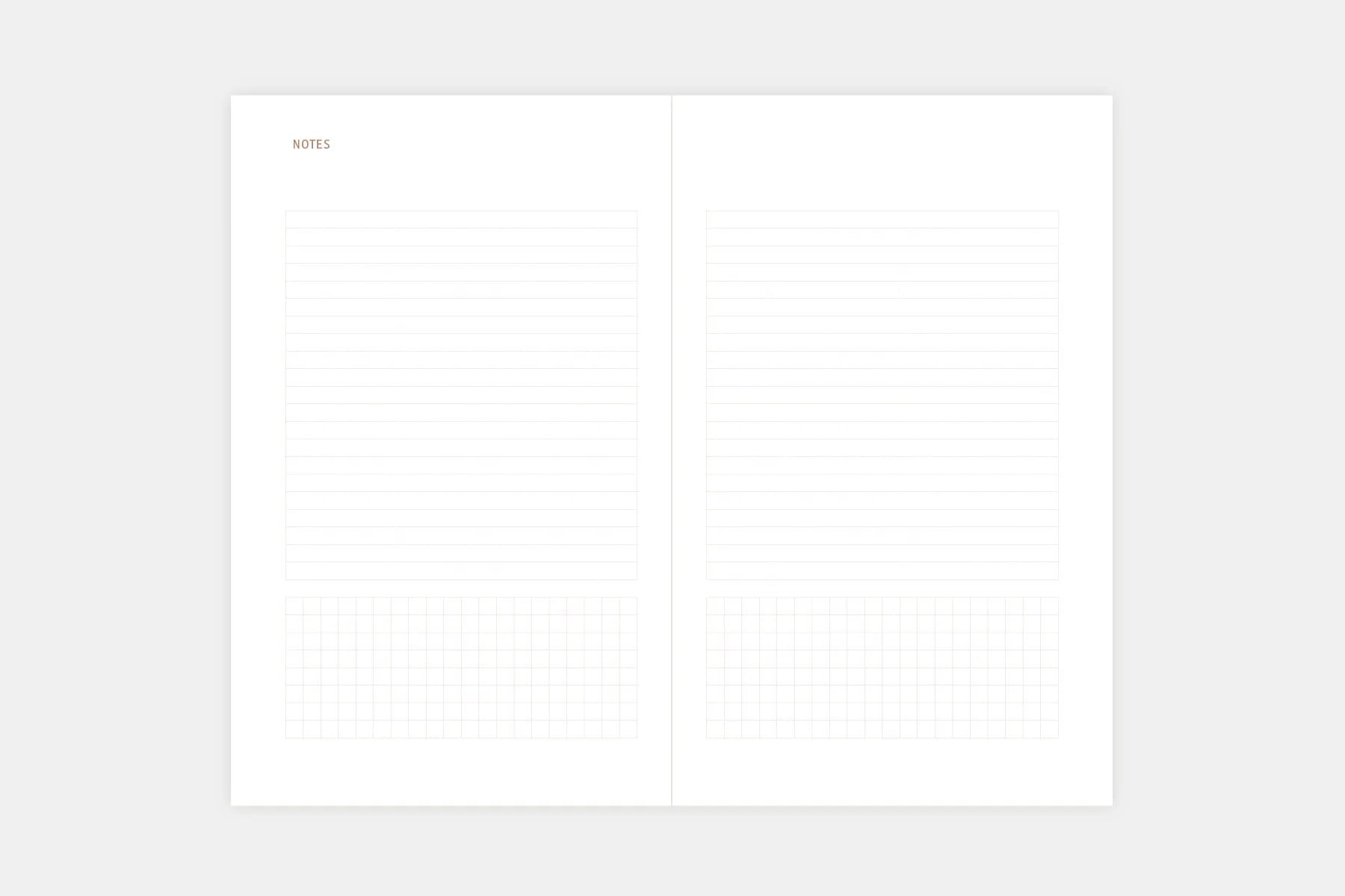 • Innen: Jährliche, monatliche und wöchentliche Doppelseiten, Seiten für Notizen